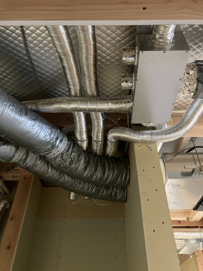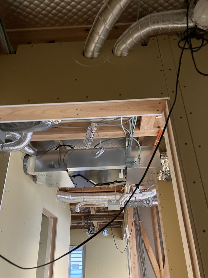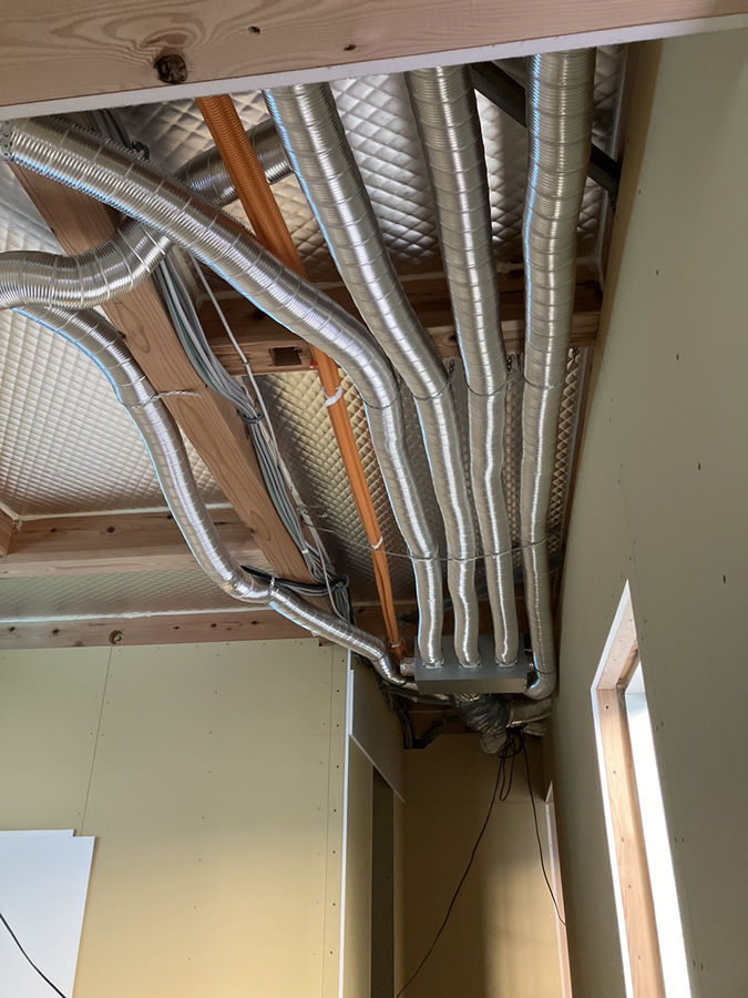 写真をご覧ください。これは天井を張る前の、施工中の様子で、各部屋へと繋がるダクトが見えています。このダクトを通して、常にきれいな空気が家全体に届けられます。