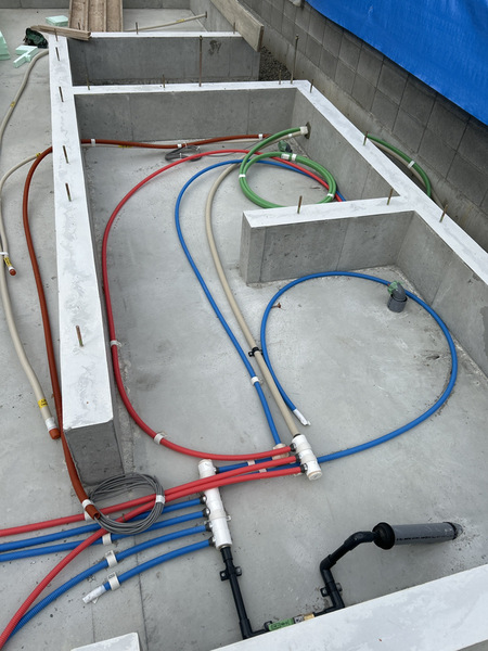 基礎の完成に続いて、先行配管も完了しました。給排水の配管位置も、丁寧に施工されています。
