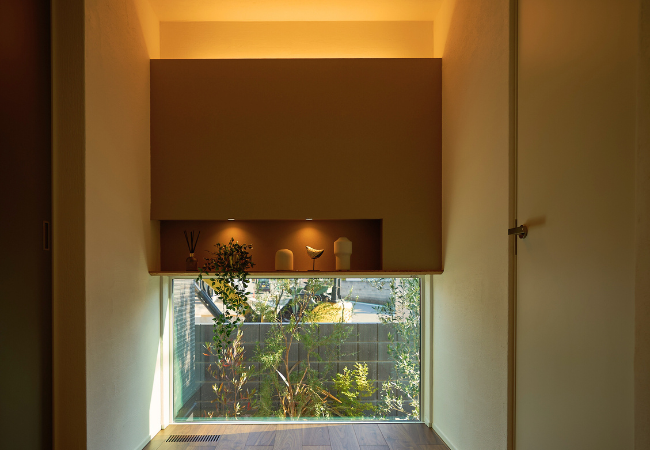 玄関を入った瞬間、坪庭の緑へ視線が抜ける開放感。間接照明の柔らかな光が包み込む、奥行きある上質な空間です。