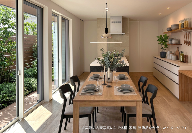 玄関、浴室、ダイニングキッチン、リビング。三つの庭が場所ごとに異なる景色を演出します。家中どこにいても自然を感じる設計が、スリムな住まいに開放感と、豊かな奥行きを創り出します。